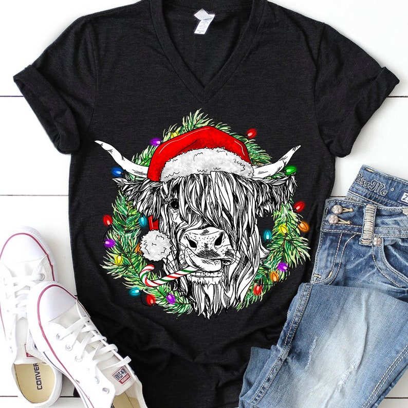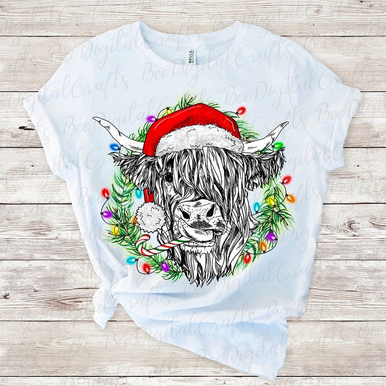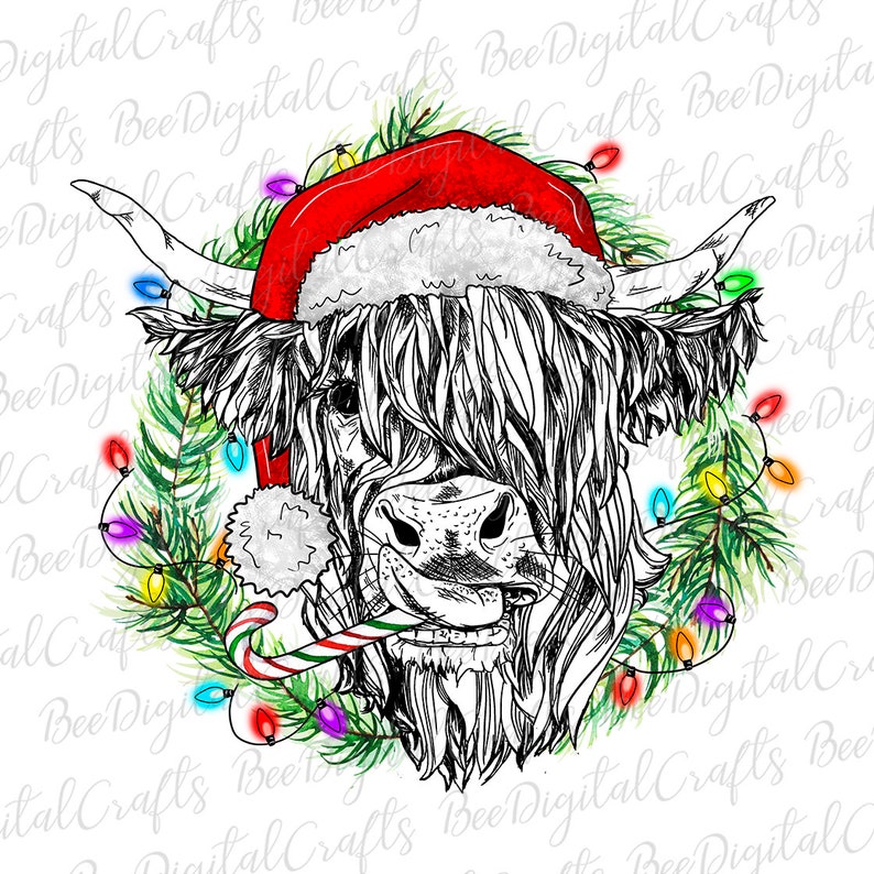 Christmas Highland Cow Svg, Christmas Highland Cow PNG Download Cow With Hat and Candy Cane Sublimation Design