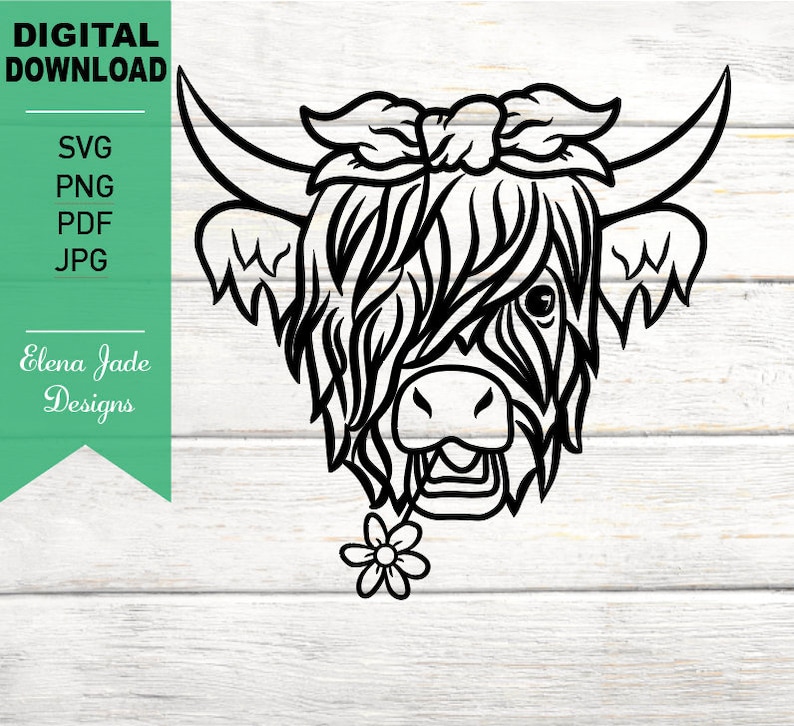Silhouette Highland Cow Svg, Cow Svg - Shaggy Cow - Cow with Bow and Flower - Highland Cow - SVG Cut File
